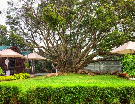 A feast for the mouth AND the eyes! We enjoy our lunch in the soft light filtered by the foliage of the awe-inspiring tree, facing a luxuriant ravine that stretches as far as the eye can see. The decor of the terrace mingles harmoniously with the setting, with its railing made of guava wood. Here, materials used are natural or recycled: stones, wood, bicycle wheels that have become chandeliers. We feel in communion with nature in this typically Mauritian place.